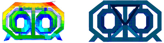 Optimal parameters are computed using a search algorithm to satisfy minimum values of αL and αH, with a fundamental frequency greater than 50 Hz and a mass not exceeding 70 kg. Under the condition where the parameters of the core ultra-stable framework structure are set to their optimal values, the equivalent thermal expansion coefficients αL and αH in two in-plane directions are determined to be 8.3 × 10−8 and 7.0 × 10−8, respectively. Based on the optimization results of the parameters, further optimization is conducted on the ultra-stable structural framework. Lightweight holes are appropriately machined in positions with minimal impact on the fundamental frequency to further reduce the overall weight of the ultra-stable structure. Additionally, diagonal reinforcements are added to positions with larger responses to enhance the structural resistance and mechanical properties of the framework. In order to verify whether the optimized structure can meet the requirements, HyperMesh is used to establish the finite element mesh model of the super-stable spacecraft structure framework. Since the main structural type of the main frame of the super-stable structure is the shell with different thicknesses, the shell element is established in the way of shell extraction during modeling, and the mesh size is 15 mm. The mesh model is shown in Figure 8. The finite element modeling software was used for pre-processing, The finite element analysis software was used for statical thermal deformation solution, and the maximum deformation of the structure under 1 K temperature load is 1.68 × 10−7 m. As shown in Figure 8, the equivalent thermal expansion coefficients αL and αH in two directions in the plane are 8.6 × 10−8/K and 7.1 × 10−8/K, respectively, indicating that the optimization results meet the requirement that the equivalent thermal expansion coefficient in the plane is less than 1 × 10−7/K.