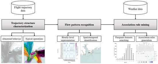 Inspired by the above facts, and without relying on prior knowledge of the domain, this paper attempts to directly explore the impacts of meteorological factors on air traffic flow patterns in a multi-source data-driven framework in order to assist the ATM decision-making process. This involves two core issues in total: the first is how to identify the main patterns of air traffic flow, and the second is how to analyze the influences of various meteorological factors on the pattern formation. To address the former, using a reconstruction-based deep autoencoder network model, the abnormal trajectories and the spatial structures followed by the normal trajectories are sequentially extracted. The analysis introduces two advanced regularization terms, in which row-sparse regularization is applied to distinguish abnormal trajectories from the whole, and Kullback–Leibler (KL) divergence regularization generates commonly used spatial structures for the remaining trajectories. With the extracted valuable knowledge in mind, a representation vector is constructed to describe the usage of airspace over time, based on which the DBSCAN clustering algorithm is used to identify the spatio-temporal patterns of air traffic flow. As for the latter, the association rule mining technique is further utilized, in which flow patterns and various meteorological factors are integrated with hourly granularity to form a sequence of transactions. Using this as a basis, the apriori algorithm is used to search for frequently occurring factor combinations and mine meaningful association rules under different flow patterns. The whole framework is validated and evaluated on the TMA of Hong Kong International Airport (HKIA). The experimental results show that the proposed framework can accurately identify abnormal trajectories, discover fine-grained spatial structures, and capture the typical spatio-temporal patterns of air traffic flow. More importantly, it concludes that the formation of different flow patterns is the result of complex interactions of multiple factors and obtains sets of key meteorological factors that contribute to each flow pattern.