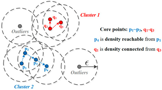 To further identify the spatio-temporal patterns of traffic flow, DBSCAN [31] is used to perform clustering analysis on dataset . As a density-based clustering algorithm, it divides data points in high-density regions into clusters, with data points in low-density regions as outliers. Specifically, DBSCAN has the core concepts of density–reachability and density–connectedness based on two significant parameters, the distance threshold and the minimum number of points . A point is density-reachable from if there is a sequence with and , where each is within distance from core point . And a point is a core point if at least points are within its distance. Moreover, two points and are density-connected if they are density-reachable from some point . Essentially, a group of density-connected points forms a cluster, and those points that are not in any of these groups are considered outliers. Figure 2 gives a simplified example of the main concepts of DBSCAN.