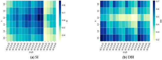 Grid search results for the SI and DBI indices. (a) SI; (b) DBI.