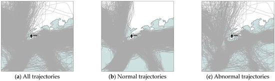 Results of abnormal-trajectory detection. (a) All trajectories; (b) Normal trajectories; (c) Abnormal trajectories.