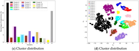 After finding abnormal trajectories from sparse matrix , the normal trajectories in are used to learn cluster-friendly representations, on which cluster analysis is performed to obtain their cluster assignments. Figure 5 gives the trajectory spatial clustering results corresponding to the best SI and DBI. As can be seen from Figure 5b,c, a total of 12 clusters are formed in the Hong Kong terminal area, of which the trajectories from the east form the two most mainstream clusters, accounting for 26.92% and 10.60% of the observations, respectively. Moreover, trajectories from the southwest and southeast also form two clusters corresponding to different runway configurations. In comparison, the routes of trajectories from the northwest and north are more complex and changeable, each forming three clusters. In order to further analyze the distribution of each cluster, the t-SNE visualization technique [29] is applied by projecting the fifty-dimensional representation space into two-dimensional space. As shown in Figure 5d, each point represents a trajectory with a color as its cluster label. It can be intuitively seen that some of the clusters exhibit good intrinsic compactness and extrinsic separability, which reflects the finding that the proposed methods can effectively learn a cluster-friendly space. However, there is overlap in the distributions of some clusters (such as those formed by trajectories from the northwest and north). This phenomenon is caused by the high similarity between trajectories on the one hand and the optimization goal on the other. As can be seen from Equation (7), the objective function needs to take into account both the trajectory reconstruction ability and cluster compactness.