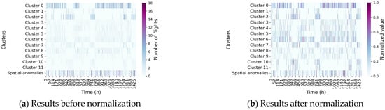 With the cluster assignment results of trajectories in mind, a more macroscopic view of the changes in airspace structure over time can be obtained. Figure 6 visualizes the per-hour-level description vectors for both months, including a total of 1464 h, for which the color reflects the number of flights belonging to each cluster or spatial anomalies. It can be seen that some clusters, such as cluster 0 and cluster 2 (corresponding to trajectories from the east), usually do not appear at the same time, mainly due to the constraints of runway configuration in airport operations. In addition, some clusters (such as cluster 8) appear cyclically over a period of time due to flight schedules. Based on the number of flights with spatial anomalies, it is possible to initially understand the complexity and uncertainty of the operating situation in the terminal airspace. All of the above valuable knowledge can be obtained from such a compressed representation (and not necessarily specific trajectory information) to more intuitively monitor and perceive the spatio-temporal characteristics of tactical operations. Furthermore, from Figure 5c and Figure 6a, it can be concluded that the distribution of each cluster is uneven, regardless of the overall scope or hourly granularity. To reduce the sensitivity of the Euclidean distance-based similarity calculation to factor scaling in the DBSCAN algorithm, each dimension is mapped to [0, 1] through the min–max normalization technique, as shown in Figure 6b.