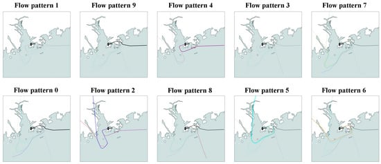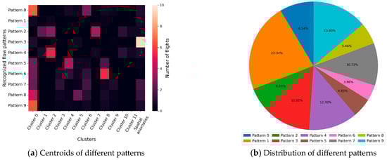 Based on the normalized description vectors, a total of 10 flow patterns were recognized by the DBSCAN clustering algorithm. Figure 7 gives the centroids of each pattern, along with their respective proportions. It can be determined that the different flow patterns are highly discriminative, and a few patterns can capture the majority of observations. A more intuitive visualization result of flow patterns is shown in Figure 8, in which the shade of color reflects the number of flights in each spatial cluster. For analytical convenience, the top six flow patterns, accounting for nearly 80% of the observations, were selected to preliminarily understand the characteristics of the arrival flow in the Hong Kong TMA.