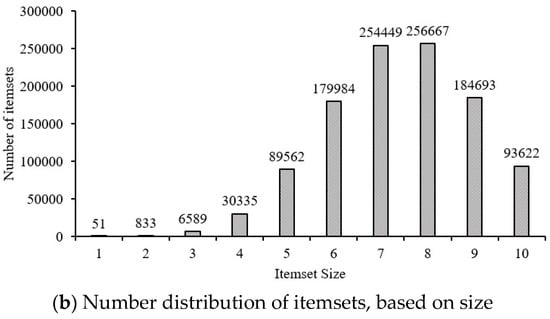 Before mining association rules, based on minimum support of 1%, the set of items that frequently occur together (i.e., frequent itemsets) are searched; Figure 9 presents the corresponding results. A total of 1,096,785 itemsets are found, of which Figure 9a shows the itemsets corresponding to the top-10-highest support values, and Figure 9b counts the number of itemsets with different itemset sizes. It can be inferred that although June and July are the most active periods of convective weather in Hong Kong, extreme weather conditions such as thunderstorms, wind shear, and cumulonimbus rarely occur, and the visibility is greater than 8 km in most periods. Based on such characteristics, in the subsequent analysis of association rules, the minimum threshold for support is also set to 1% to ensure that the rules related to extreme weather can be captured. Additionally, due to the low support threshold, a large number of itemsets are considered frequent, and the number of itemsets reaches a maximum when the size of the itemset is 7 or 8. Considering the scale of the itemsets and previous studies, this paper mainly analyzes the association rules associated with itemset sizes of 2 to 4.
