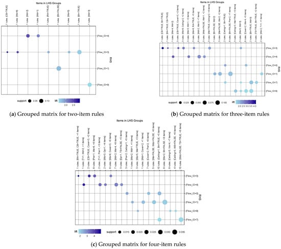 To better identify the key factors affecting different flow patterns, a group matrix-based visualization technique [44] is applied, in which the antecedents of different rules are grouped by clustering, and the rules are sorted by “interestingness” (“lift” is used in this paper). Figure 10 visualizes the grouped matrix of the two-item, three-item, and four-item association rules, respectively, which is a balloon plot with each grouped antecedent as a column and each consequent as a row. The color of the balloon represents the aggregated lift in the group, and the size of the balloon indicates the aggregated support. Here, both metrics are measured by the within-group median. A small, dark balloon means that the group of rules has a lower frequency of occurrence but higher interest and value, and a large, shallow balloon means that the group of rules has relatively lower interest and value but a higher frequency of occurrence.