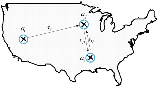 Identifying the causal relationship of delays in airport networks is challenging in scientific research. In actual operation, many reasons cause airport flight delays and collecting delayed data makes it difficult to obtain complete and adequate data. However, considering the emergence of these factors, they are ultimately feedback on the delay value of the airport. Therefore, by mining causal relationships through the time series of airport flight delays, we can capture the characteristics of airport flight delay propagation. Assuming there are airports in the airport network, represents a set of airports, where represents the delay time series of airports i, to discover causal relationships between time series in the airport set . A directed causal graph is constructed to effectively represent the causal relationship between airports, as shown in Figure 1, with vertices representing the time series of airport delays and directed edges indicating the existence of causal relationships. Therefore, if there is a real causal relationship between airports, there is an edge pointing towards j. The set represents the weight of the edges, where represents the weight of the edges , i.e., the degree of delay impact of airport i on airport j.