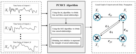 Figure 2 shows the diagram of causal relationship mining for airport delay propagation. Firstly, the delay time series is constructed based on the airport’s historical operational data. Then, the PCMCI algorithm is established, which includes two stages. In the first stage, a connectivity graph connects all pairs of time series nodes with directed edges. Then, the PC1 algorithm minimizes excess variables in the condition set as much as possible to obtain an initial set of parent nodes. This set not only contains actual parent nodes but also false parent nodes. The PC1 algorithm is based on the PC-stable algorithm for Markov blanket discovery. The parent node represents the “cause” airport that caused the delay at the target airport. In the second stage, the father variable set obtained in the first stage is tested using MCI (momentary conditional independence) to remove false causal relationships among highly interdependent time series variables and get an accurate time series causal diagram.