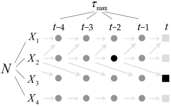 where represents the maximum delay time. Figure 3 illustrates the parent variables for four time series, with a maximum delay time of . Each variable has a set of 16 parent variables (shown in gray boxes).