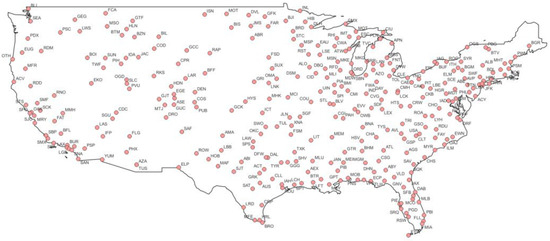 This study employed a case analysis utilizing flight historical operational data from 339 airports in the United States, as illustrated in Figure 5, spanning from 25 March 2018, to 30 March 2019. The data were obtained from the Bureau of Transportation Statistics “https://www.transtats.bts.gov/DL_SelectFields.asp?Table_ID=236” (accessed on 2 March 2023). Each data entry includes attributes such as the operating day, departure airport, arrival airport, scheduled departure time, actual departure time, scheduled arrival time, actual arrival time, and whether the flight was canceled. Based on the planned and exact departure times, flights that departed earlier than expected have a delay time of 0. In contrast, flights with delays exceeding 180 min have a delay time of 180 min. Flights that were canceled at each airport were removed from the dataset, as canceled flights only result in wasted resources for the associated airports and do not contribute to delay propagation in the airport network. When the time interval was 60 min, each day was divided into 24 periods. The average departure delay for each airport during each period was calculated over 371 days. We used this information to construct a delay time series of length 371 × 24 for each airport, representing the delay characteristics of the airport. These delay time series for each airport were used as input data to train the predictive model.