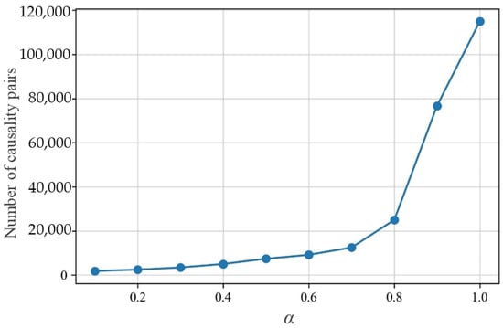 Figure 6 depicts a line graph showing the variation in the number of causal relationships obtained in the first stage as changes. These causal relationships include both true causal relationships and spurious ones. The graph shows that when is set to 1, all initial parent nodes are retained, and none of the dependent variables are removed. Therefore, in the case of 339 airports, there are a total of 339 × 339 causal relationship pairs. Before reducing to 0.7, the number of causal relationship pairs decreases rapidly. After reaching 0.7, further reduction in leads to a slower decline in the number of causal relationship pairs. We can observe that setting too small may result in removing authentic causal relationships. Conversely, setting too large may result in a significant presence of spurious causal relationships, leading to increased runtime in the second testing stage and decreased efficiency.