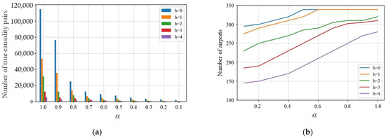 Figure 7b displays a line graph illustrating the variation in the number of airports with changes in the and h values. For any given h value, the number of airports increases as the value increases. When is between 0.6 and 1, or when h is 0 or 1, the number of airports includes all the airports. When h is 2, the number of airports decreases slowly, but when h is 3 and 4, the number of airports decreases significantly. Additionally, when h is 0 or 1, the number of airports declines after the value goes below 0.5. When h is 2, the number of airports decreases after the value goes below 0.7. As the h value increases, the number of airports decreases earlier with changes in the value, indicating that the valid causal relationship pairs are more sensitive to the value. Combining Figure 7a,b, setting the value to 0.3 and h value to 3 would obtain a sufficient number of valid causal relationship pairs and reduce spurious causal relationships caused by solid autocorrelation. At this point, the number of authentic causal relationships and the number of involved airports are conducive to making decisions for the airports.