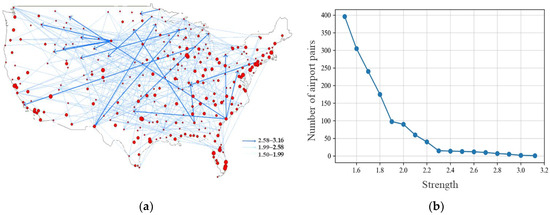 Causal relationship network diagram of airport delays in the United States: (a) causal relationship network diagram; (b) strength distribution.