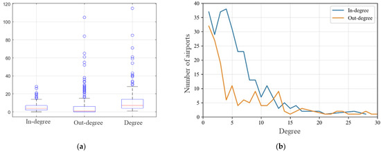 Figure 9a presents a box plot illustrating the distribution of in-degree, out-degree, and degree for airports in the network. The degree of an airport is equal to the sum of its in-degree and out-degree. The average in-degree is equal to the average out-degree, which is 5.66, indicating that, on average, an airport is influenced by delays from approximately six other airports and also influences delays at approximately six other airports. For in-degree, the minimum value is 0, indicating that delays at other airports do not cause delays at these airports but are rather due to internal factors such as weather conditions. Most airports have in-degree values ranging from 2 to 7, suggesting that although delays at other airports influence them, they are not affected by many other airports (the number of influencing airports is not excessively high). The maximum in-degree value for an airport is 28, which corresponds to Grand Forks International Airport (GFK). This airport has an average daily departure volume of 6 flights, indicating that smaller airports with lower flight volumes are more likely to be influenced by delays from multiple other airports. For out-degree, the minimum value is also 0, indicating that delays at these airports do not impact delays at other airports. Except for Rapid City Regional Airport (RAP), which has an out-degree value of 105 and impacts a significant number of airports, 75% of airports have out-degree values of 7 or below, suggesting that they only affect delays at the airports they are most closely connected to.