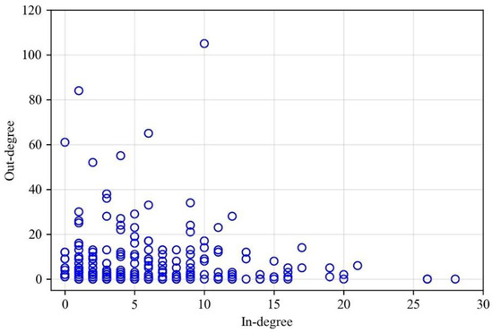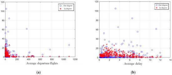 Figure 11b shows the relationship between the average departure delay at each airport and its degree value. The relationship between airport delay levels and in-degree values is similar to that between flight volume and in-degree values. Airports with smaller average delay times are more likely to be influenced by delays from other airports. There is no clear relationship between an airport’s delay causing delays at different airports and its average delay time, but most out-degree values are below 10.