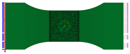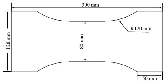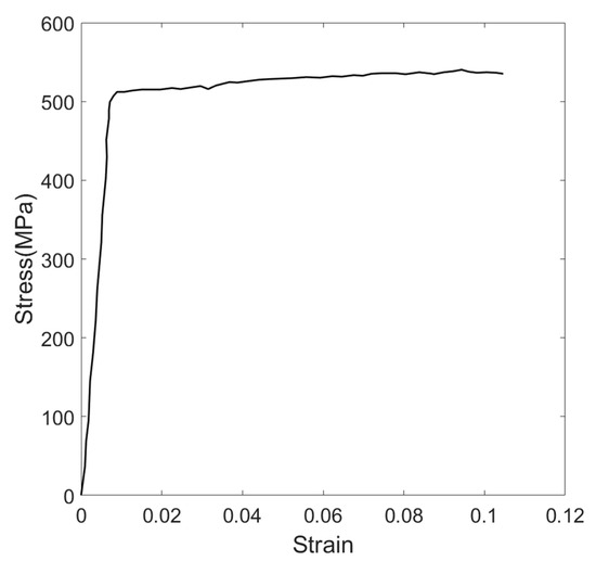 The material studied in this paper is the 2060-T8E30 aluminium–lithium alloy, which has improved fracture toughness and corrosion resistance compared to the conventional 2024 aluminium alloy materials; its chemical composition is listed in Table 1 [30]. Figure 1 shows the monotonic tensile curve of the 2060 aluminium alloy, from which the elastic modulus, yield stress, and strength limit of the material can be obtained as listed in Table 2. The specimen is a 2 mm thick plate, with its geometric configuration and dimensions depicted in Figure 2.