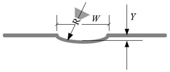 In routine aircraft maintenance, the width and area of craters caused by impacts such as stones and hailstones are difficult to measure, while the depth is convenient to obtain. Therefore, the crater width was fixed during the pre-impact test and the focus was on the relationship between crater depth and fatigue life. A pit with a specified width-to-depth ratio was generated at the centre of the specimen using a steel spherical hammer with a diameter of 25.4 mm, as shown in Figure 3, where W is the width of the pit and Y is the depth of the pit. In the impact tests of this paper, W was fixed at 20 mm and the impact depth Y was 0.67 mm, 1.33 mm, and 2.00 mm for width-to-depth ratios of 30, 15, and 10, respectively.