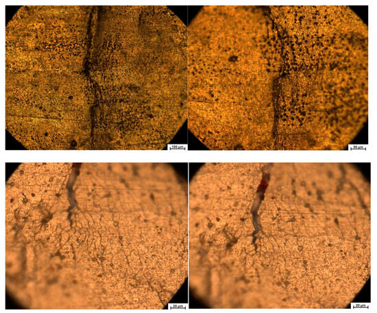 A discernible step formed at the periphery of the impact pit, leading to notable stress concentration. The depth of the impact pit and the magnitude of stress concentration proportionally escalated with increasing impact energy. Concurrently, the impact induced a proliferation of micro-cracks within the specimen, as shown in Figure 5.