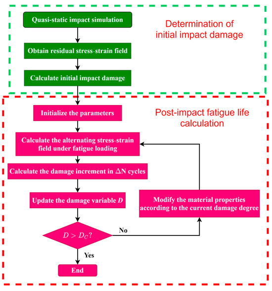 The analysis of post-impact fatigue issues involves two aspects: the determination of the initial impact damage and the calculation of the fatigue life considering the combined effect of initial impact damage and impact pit. In the theory of continuum damage mechanics, material properties are related to the damage variable. Therefore, the material properties are modified accordingly after the damage variable is updated. The procedure for post-impact life prediction is shown in Figure 8, with the following steps: