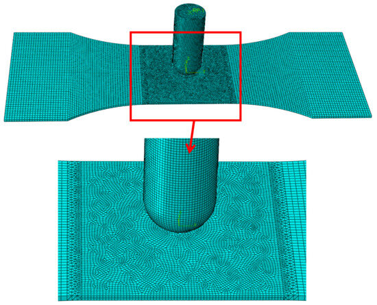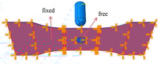 A quasi-static simulation of the impact process was carried out on the ABAQUS platform. The corresponding finite element model, presented in Figure 9, comprises a plate specimen and a hemispherical hammer. Due to the significantly higher stiffness of the hammer relative to the specimen, the former is modelled as a rigid body and the latter as an elastic–plastic entity. The lower surface of the specimen is fixed except for a circular surface with a diameter of 20 mm located in the centre, which is free, as shown in Figure 10. The C3D8R reduced integration element with eight nodes and one integration point was adopted in the finite element model, and the mesh size in the vicinity of the impact pit was determined to be 1 mm via mesh convergence calculation. In the simulation of the impact, the depth of the impact pit was 0.67 mm, 1.33 mm, and 1.67 mm, respectively, which is consistent with the experimental conditions.