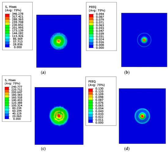 - A quasi-static impact simulation was carried out to obtain the residual stress–strain field of the specimen after impact. The calculation results show that the maximum residual stress of the specimen decreases while the maximum residual strain increases with the increase in the impact pit depth.