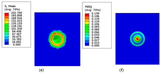 Residual stress–strain field distribution in the vicinity of the impact pit; (a,c,e) residual stress distribution for impact pit depths of 0.67 mm, 1.33 mm, and 2 mm, respectively; (b,d,f) residual plastic strain distribution for impact pit depths of 0.67 mm, 1.33 mm, and 2 mm, respectively.