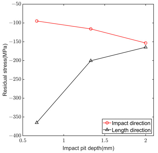 Figure 11 presents the residual stress distribution and residual strain distribution at three different impact depths. It can be seen that the maximum residual stress of the specimen decreases from 346.3 MPa to 202.7 MPa and the maximum residual strain increases from 0.0944 to 0.1593 as the depth of the impact pit increases. When the hammer impacts the specimen, the specimen yields and enters the plastic stage, at which time the maximum Mises stresses at the three impact pit depths are almost the same, because the stress–strain curve of the material is nearly horizontal after entering the plastic stage. After the hammer is out of contact with the specimen, a portion of the specimen’s deformation recovers, resulting in some relaxation of the Mises stress. In the case studied in this paper, as the depth of the impact pit increases, the more the Mises stress relaxes; therefore, the maximum residual Mises stress after impact is smaller. Figure 12 shows the residual stresses along the impact direction and the length direction of the specimen for the three impact pit depths. It can be found that as the impact pit depth increases, the compressive stress in the length direction of the specimen decreases while the compressive stress in the impact direction increases. The maximum residual strain occurs at the bottom of the impact pit for all three cases. When the impact depth is small, the maximum residual stress is observed at the bottom of the impact pit, whereas it shifts to the junction between the free and fixed surfaces at larger depths.