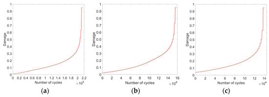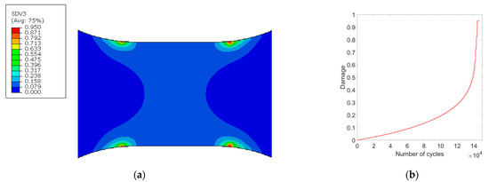 - The jump-in-cycle method is used in the fatigue life accumulation considering that it is very time-consuming to calculate the fatigue life cycle by cycle. It is assumed that the alternating stress–strain field is the same within a finite number of cycles and each cycle produces the same damage increment. The damage increment resulting from cycles is calculated with Equation (20). Subsequently, the damage variable and the number of loading cycles are updated. Typically, it is reasonable for to be 1–2% of the calculated fatigue life.