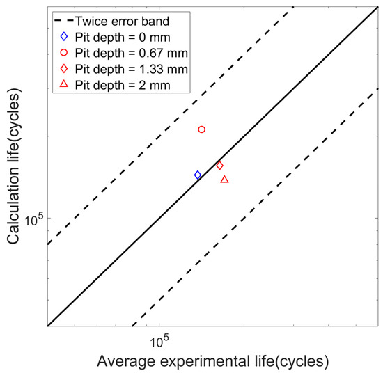 The peak loads for impact pit depths of 0.67 mm, 1.33 mm, and 2 mm were 28 kN, 25 kN, and 22 kN, respectively, and the stress ratios were 0.06 for the three cases, which also coincided with the experimental conditions. Figure 15 presents the damage distribution in the vicinity of the impact pit for the three cases, revealing that the critical elements are distributed in a long strip perpendicular to the direction of load application. Figure 16 shows the damage accumulation curves for the critical elements at three impact pit depths. The damage increases exponentially with the number of loading cycles, and the damage accumulates slowly in the early stage, while it grows rapidly in the later stage. The damage accumulates from 0.0104, 0.0217, and 0.0382 at a cycle number of 0 for impact pit depths of 0.67 mm, 1.33 mm, and 2 mm, respectively, and the number of cycles at which the damage accumulates to the critical value (taken as 0.95 in the numerical simulation) is 212,000, 156,000, and 138,000 for the three cases, respectively. The comparison between the calculated lives and the experimental lives is given in Figure 17, from which it can be found that none of the calculated lives fall outside the twice error band, demonstrating the feasibility of the methodology in this study.