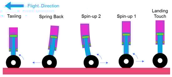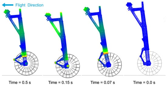 These motions are represented in Figure 3 based on the time sequence, where the importance of strut bending and bearing contact simulation can be seen. Following the landing, the tires and ground friction caused by the wheels from their stationary position began to accelerate the rotation. The friction forces then pass to the wheel axle, causing the strut to bend backward. To a certain extent, when the relative friction has slowed, the stored elastic force drags the wheel back, demonstrating the forward and backward swinging characteristic of the wheels until all of the force has reached equilibrium.