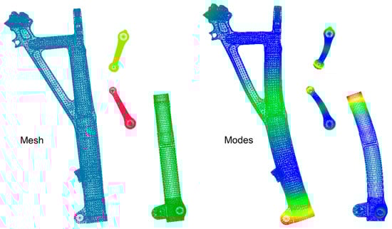 The ADAMS requires additional connection nodes between components, as well as preset action points for the air spring force and oil-damping force within the buffer. These connection points are linked to the finite element model mesh via a rigid element (RBE2). The connection points between the components are then defined as interface points for establishing the subsequent joint connections. By using the modal analysis module SOL103 of MSC.NASTRAN 2018.0, the FEM file (BDF format) of each component is then modal analyzed, and the modal neutral file (MNF format) is output and finally used by the ADAMS software V2017.2 to represent each flexible body. The mesh models and typical bending modes of the flexible bodies are shown in Figure 6.