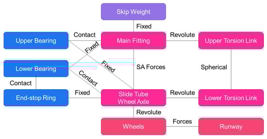 By only adopting the main parts of the landing gear, the number of joint connectors is reduced so as to make the simulation more efficient. In this model, the joint connectors of the fixed joint, revolute joint, and spherical joint were used to assemble the outer cylinder, the piston rod, the upper torsion link, the lower torsion link, and the bearings. As shown in Figure 7, the topological relationship demonstrates these joint connectors, as well as the bearing constraints, where the shock absorber (SA) forces connections of gas-spring and oil-damping, and the wheels and tires and the runway definition, as well as the components of the landing gear drop system, were assembled as one.