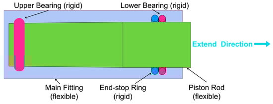The detailed connection principle between different parts and different surfaces can be described with the help of Figure 3. The upper bearing and lower bearing are simplified as a rigid circular bearing. Both of them are established with a fixed joint and a rigid–flex contact. The upper bearing is fixed at the upper end of the piston rod and so moves together with the piston rod while contacting the inner surface of the outer cylinder. The lower bearing is fixed at the lower end of the cylinder, contacting the outer surface of the piston. The lower bearing is modeled in a similar way, based on the real structural connection, creating a fixed pair with the cylinder and defining a rigid–flex contact with the inner surface of the piston rod. Moreover, this is so we can simulate the end-stop function that prevents the piston rod from extending out under the inflation pressure, which corresponds to the structural limiting force mentioned above. It also creates another rigid ring on the upper of the lower bearing, which was defined by its contact with the lower bearing and fixed joint with the piston rod.