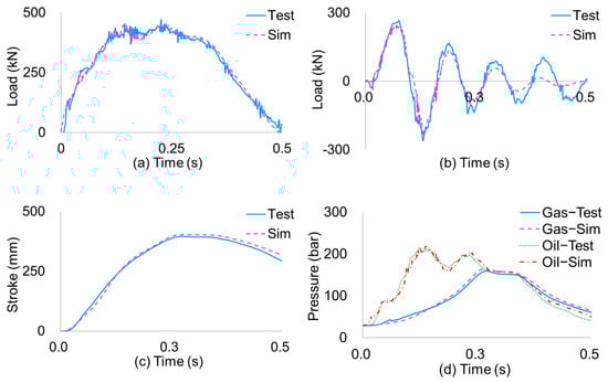 Dynamic response results: (a) vertical loads, (b) longitudinal loads, (c) shock absorber stroke, and (d) shock absorber inner pressure.
