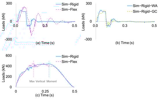 Strut flexibility influence: (a) longitudinal WA loads; (b) longitudinal loads of WA and GC; (c) vertical WA loads.