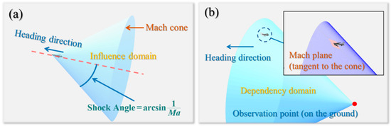 Let us consider a fixed observation point on the ground. The dependence domain of this observation point is the cone region with a shape similar to the Mach cone but with an opposite direction. From the moment the aircraft passes through the cone, observers on the ground begin to feel the propagation of disturbances.