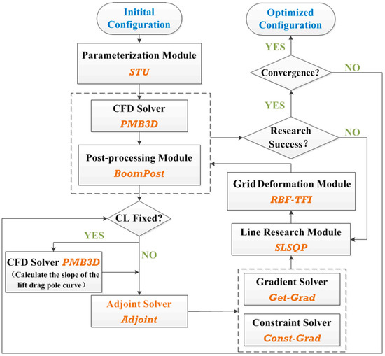 The process of this method is shown in Figure 2. It has a typical architecture of gradient optimization. The program has undergone modular design, such as STU for calculating the logical coordinates of parameterized design variables, PMB3D for solving the flow field, BoomPost for near-field overpressure extraction and far-field prediction, Adjoint for solving the adjoint equation, Get-Grad for solving the gradient, RBF-TFI for achieving grid deformation to obtain a new shape, and SLSQP for optimization algorithm.
