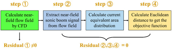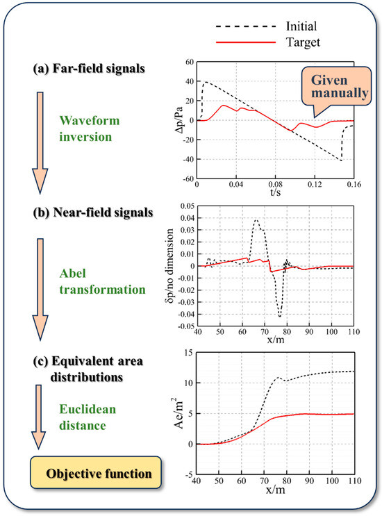 A reasonable objective function plays a crucial role in the effectiveness of adjoint optimization. The optimal function should be able to form a sonic boom signal with a minimum perceived noise level in the far field. Therefore, inferring the near field from the target far field is a commonly used method for inverse design [35,36,37,38,39,40,41]. Waveform inversion is a key step [42,43]; designers should first design a far-field sonic boom signal from a physical perspective and then inverse the corresponding near field to obtain the target equivalent area distribution.