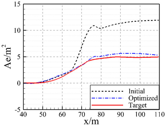 where M is the vector dimension of the equivalent area distribution, which is equal to the number of grid points of the near-field sonic boom signal, Ae is the vector of the current equivalent area distribution, and is the vector of the target equivalent area distribution.