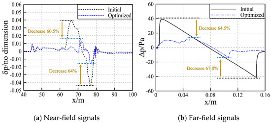 Figure 3a shows the inverse near-field signal. Although it does not completely match the real near-field waveform, Figure 3b shows that their corresponding far-field sonic boom signals are almost identical, indicating that the inverse near-field wave signal is equivalent to the real near-field signal.
