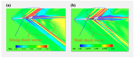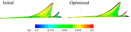 Figure 17 shows the pressure distribution on the upper and lower wing surfaces before and after optimization. After optimization, the shock waves on the upper wing surface significantly weakened, while the shock wave positions on the lower wing surface moved backward and toward the wing tip. In addition, a high-pressure zone appeared on the lower wing surface of the flat tail to increase the lift distribution at the flat tail, indicating that for the configuration of the aircraft with an engine, as shown in this paper, designing a higher lift distribution at the flat tail is beneficial for adjusting the equivalent area distribution of the jet region, thereby reducing the level of the sonic boom.