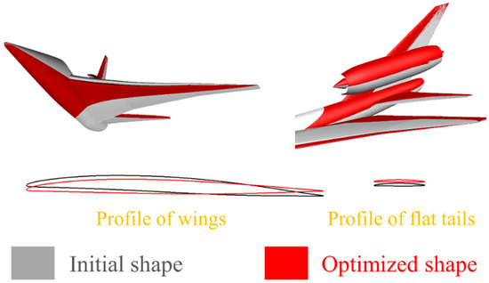 Compare the aerodynamic shape changes of the aircraft and analyze the profiles of the wing and flat tail. In this paper, the profile position is taken at a distance of 1m from the symmetrical plane in the spanwise direction. Figure 16 shows the comparison results. After optimization, the angle of attack of the wing decreases and its curvature decreases, while the curvature of the flat tail increases, the angle of attack increases, and the installation position moves up. The curvature of the fuselage also varies to a certain extent, with the nose drooping and the tail rising, making the fuselage axis more inclined toward a wavy distribution.