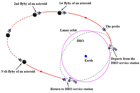 Missions toward PHAs require considerable propellant mass consumption. To solve this problem, the preliminary mission analysis and trajectory optimization in an Earth–PHA transfer have been investigated through the use of propellantless or continuous thrust propulsion systems, such as the study of the solar sail-based Apophis rendezvous mission [15] and the investigation of the potentialities of an electric sail for missions toward PHAs [16]. However, the current asteroid explorations are still expensive and inefficient. Low-cost mission concepts to explore large numbers of PHAs are desired. We proposed a mission scenario involving the reusable probes that explore the PHAs with multiple round trips. It is assumed that a batch of reusable probes depart from and return to a DRO Service Station (DSS) deployed in a distant retrograde orbit (DRO) in cislunar space, where the probes are refueled for reusability. In a single round trip from cislunar space to PHAs, the probe flies by one or more PHAs, as shown in Figure 1. Logically, multiple round trips of reusable probes explore large numbers of PHAs. This concept is inspired by asteroid redirect, reusable probes, and refueling in a DRO. They were separately studied previously and combined in this research. For example, the Earth-Moon transfer orbits based on DRO are investigated [17,18,19] and a lunar-orbiting satellite constellation based on DRO for wireless energy supply is proposed [20]. It is noted that refueling in a DRO has also been proposed [21,22,23,24], including supporting the missions to Mars [25,26].