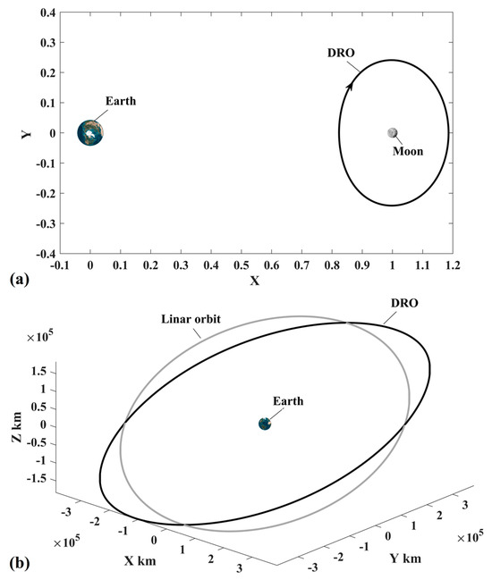The orbital motion of the DSS is modeled by the EM-CRTBP. Specifically, the DSS is deployed in a DRO, which is a stable periodic orbit around the Moon. The orbit of the DSS expressed in ROT is approximated by Fourier polynomials, and the ephemeris of the DSS is given in Appendix B. The DSS’s orbits in both ROT and ECI are shown in Figure 2.
