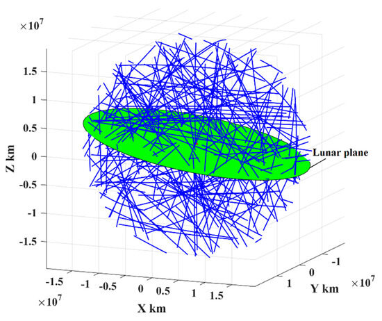 The PHAs in this study are referred to as those that reach inside the sphere with a radius of 20 million kilometers relative to Earth. The orbital motion of the PHAs is assumed to follow the heliocentric two-body orbital dynamics. We selected a total of 167 PHAs with diameters no less than 100 m as the representative targets. As shown in Figure 3, the part trajectories of these PHAs denoted by blue lines are nearly straight inside the proposed sphere.