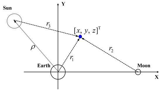 where is the Earth–Moon mass ratio; is the normalized mass of the Sun; is the position vector of the Sun in ROT (see Appendix A); and , , and are the distances from the probe to the Earth, Moon, and Sun, respectively, which are expressed as follows:
