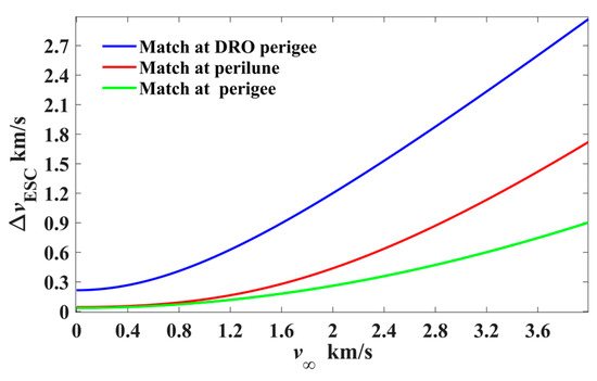 Moreover, assuming that the probe departs from the Earth’s SOI with a desired escape velocity and reaches the Moon in the same direction as the lunar velocity, its velocity relative to the Moon is expressed by