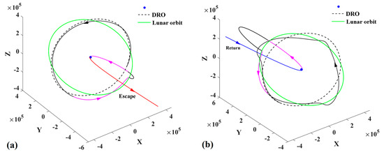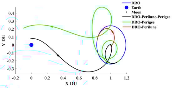 Unlike Equation (2), Equation (9) is decoupled with the ephemerides of the Sun and the Moon and then is more concise for the analysis of the trajectories reaching the perilune and the perigee from the DRO, which includes the analysis of the low-energy transfer trajectories with the WSB ballistic arcs (see Section 3.3 for details).