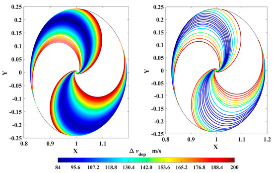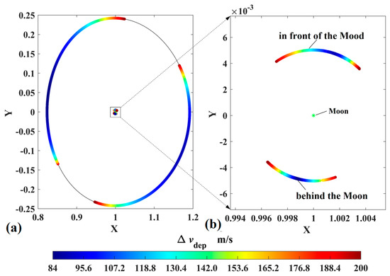 Considering that the DRO is a retrograde orbit around the Moon, the simplest and most efficient strategy to rapidly escape from the DRO to a perilune is exerting an opposite impulse velocity on the probe; then the probe approaches the Moon. The transfer trajectories by which the probes reach perilune with an orbital altitude of 200 km are shown in Figure 7, where the color bar represents the velocity impulse magnitudes, and the minimum is 84 m/s. The departure positions shown in Figure 8 are concentrated in two areas, and their corresponding arrival perilunes are distributed in the regions in front of and behind the Moon. Both Figure 7 and Figure 8 indicate that the probe is able to reach the low-altitude perilune with a small velocity impulse, which provides the opportunities to utilize lunar gravity assist.
