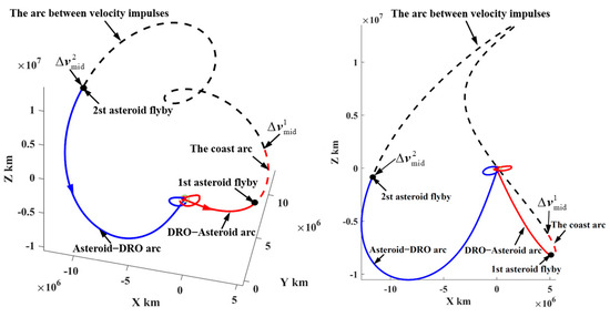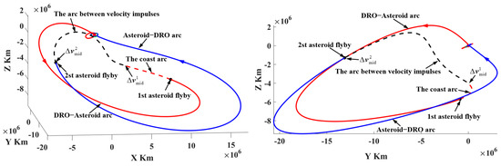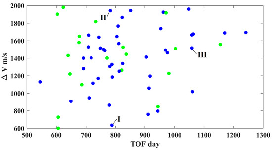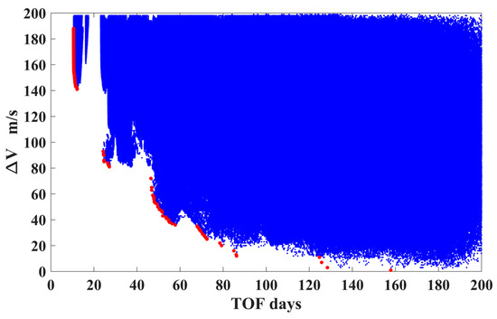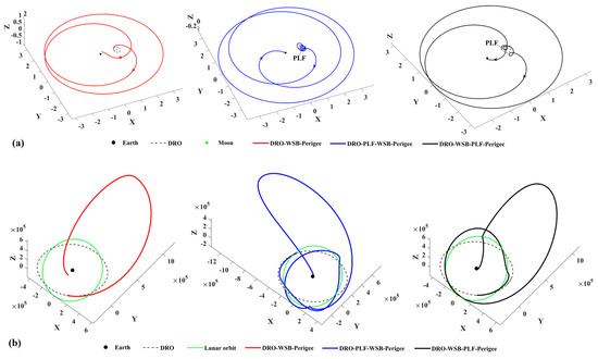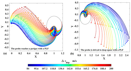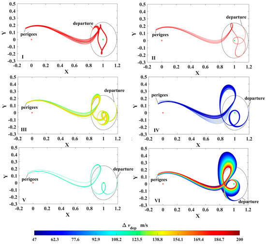 Similarly, the strategy for reaching a low-altitude perigee is exerting a velocity impulse (also no more than 200 m/s) in the opposite direction on the DRO to decrease orbital energy. Let the TOFs be no more than 30 days; it is found that six types of transfers can reach the perigees inside the Earth’s sphere of 70,000 km, as shown in Figure 9. In this case, the minimum velocity impulse is 47 m/s, and the minimum perigee altitude is 51,339 km. However, these results show that the perigee’s altitudes are still high. To further reduce the perigee’s altitude, the transfer trajectories in case 3 that use a PLF are introduced.